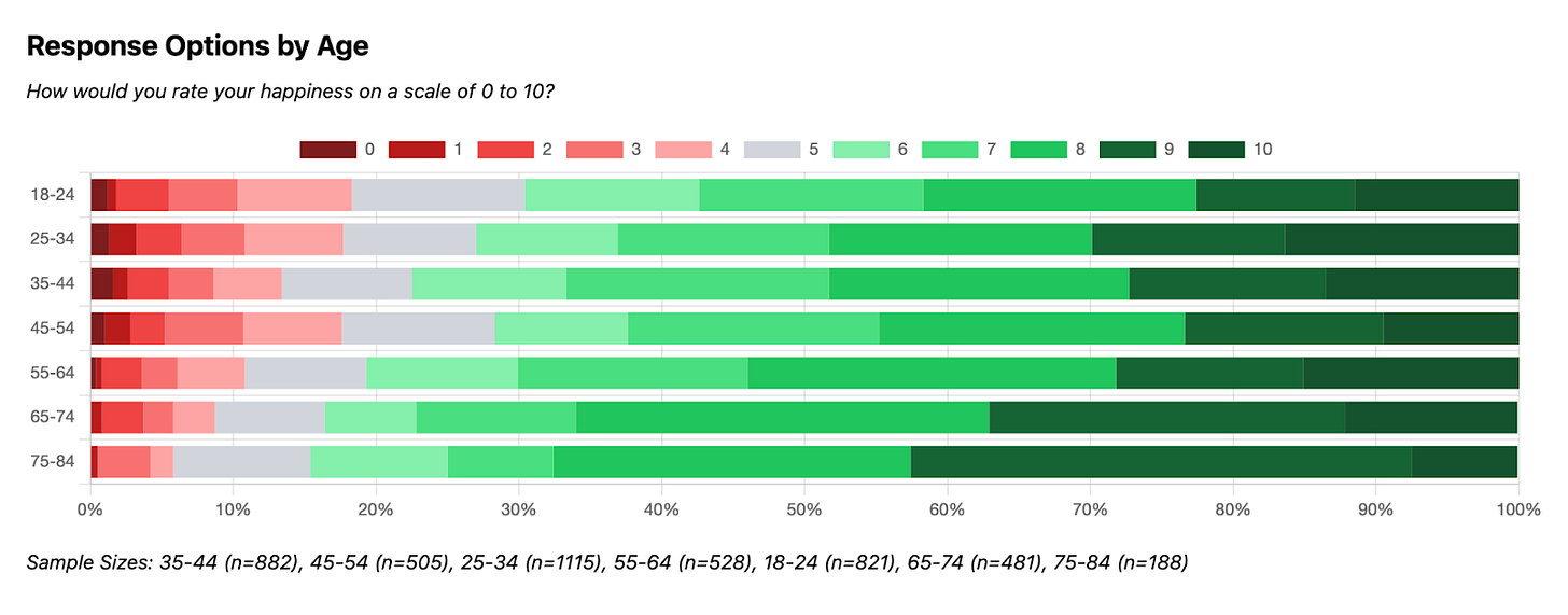 Below is an example of some work I’m doing with a couple wellbeing nonprofits to assess happiness across age groups globally.