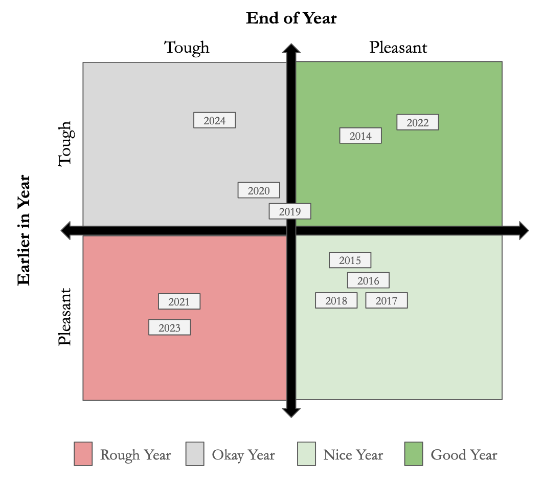 If you’ve had a tough year, I’m hopeful that an at least okay year is ahead of you. And it’s worth remembering that dividing the year at different points would yield different outcomes -- years that start strong and end poorly would feel completely different if we recognized their endings in June instead of December.