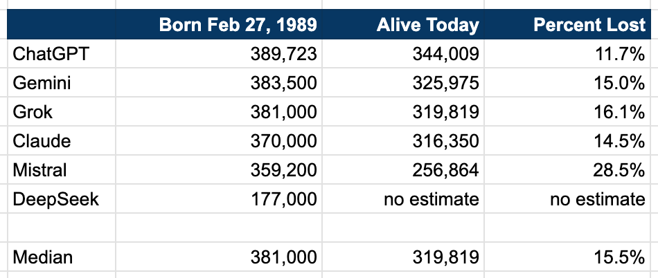I used the same prompt to create deep research14 reports from Gemini, Claude15, DeepSeek16, Mistral, Grok17 and ChatGPT. I’ve linked to each report so you can review them yourself; there’s lots of information about actuarial estimates! Most important to me, though, was trying to get a sense for our current population size.