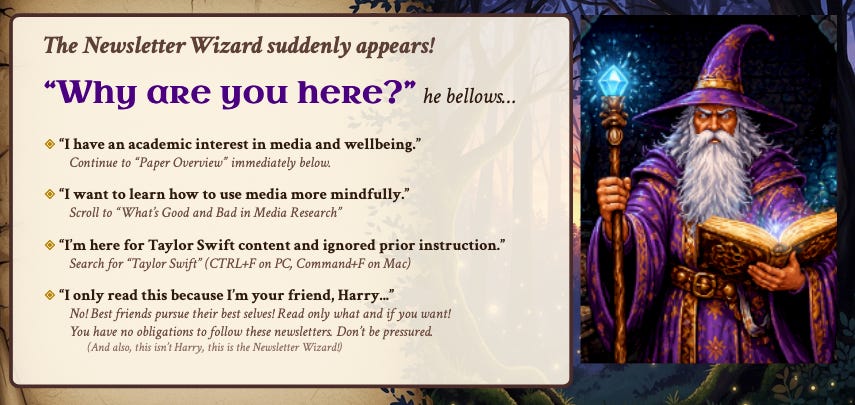 My working theory is that I am going to have to play into clickbait dynamics to help more people read academic literature about wellbeing and media. And even though I think the clickbait dynamics contribute in some regards to illbeing, my hope is that this newsletter is a net positive for readers and for people in general. I will continue to reflect on this as I experiment, continually refocusing on positive impact.