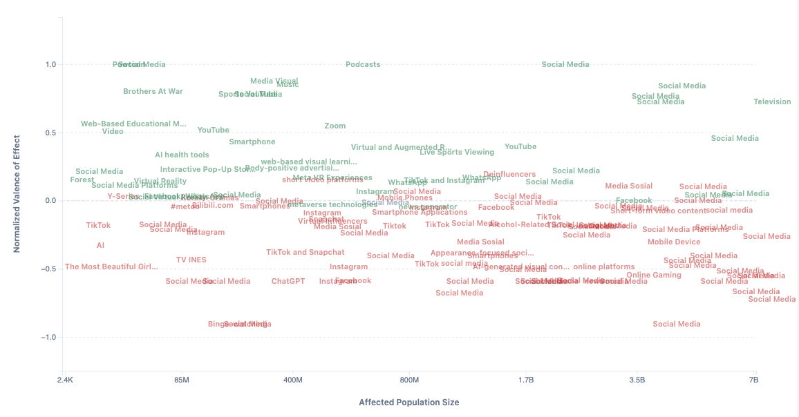 Topic-wise, “social media” remains a frequent focus for these studies -- over half of the studies identified make it their target, 80 of the 155 identified papers. Of those 80, nearly four in five (77.5%) identify negative effects, ranging from FoMO, burnout, reduced physical activity, addiction, problematic use, reduced self-esteem and more. On the positive side, some studies found social media encouraging help-seeking, improving mood, increasing interest, increasing informedness and reducing stigmas.