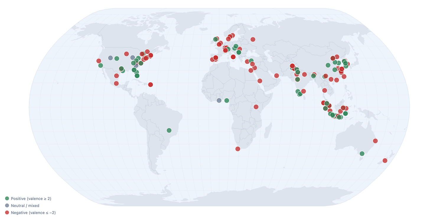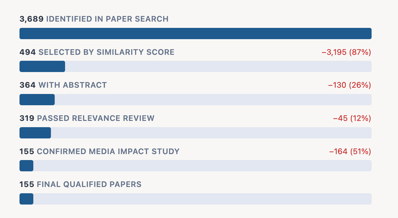 As discussed last month, the process I’m using here has stages -- first identifying papers that match the boolean query “media OR wellbeing”, then filtering for the highest semantic score matches, removing papers without abstracts and completing a three-part agentic review. There were 3,896 papers identified this February and, of those, 155 qualified for analysis -- selected as examining the impact of media (as an independent variable) on wellbeing (as a dependent variable).