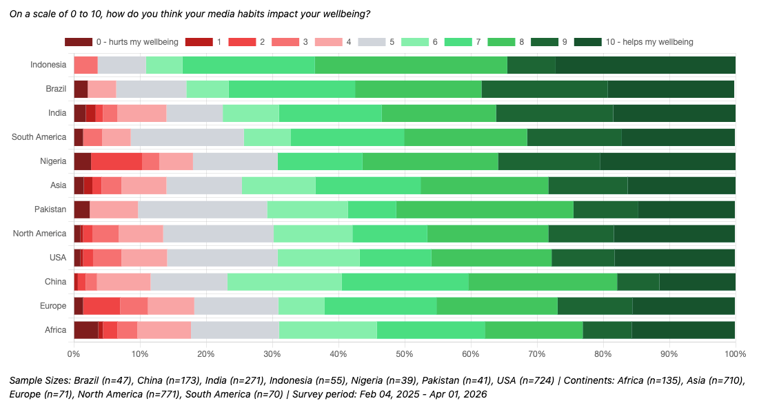 This general trend of media-critical papers coming out of the US and Europe aligns somewhat with responses from a question I ask in the Mic Check Media Daily Global Omnibus7. Here we find that residents of Europe and the USA are among the regions where residents are most likely to believe that their media habits hurt their wellbeing.